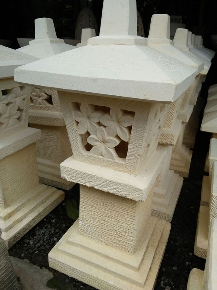 Motif rumah Bali dan ukiran bunga. Terbuat dari bahan batu paras Jogja yang berwarna putih.
