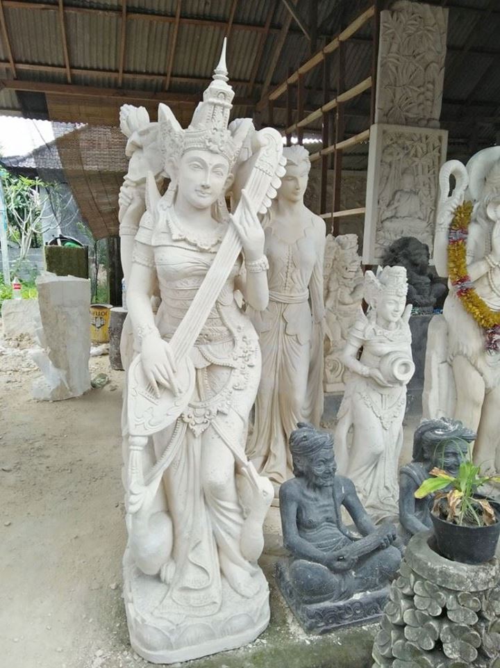 Patung Batu Bali Motif Dewi Saraswati. Terbuat dari bahan batu paras Jogja.