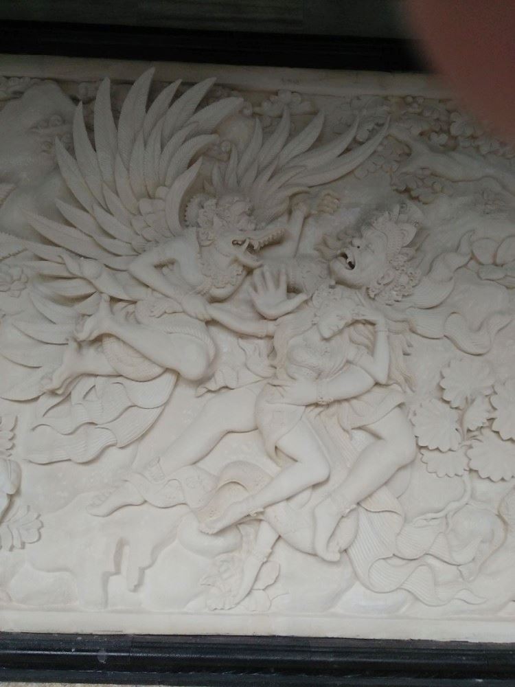 Relief Dinding Rumah Motif Wiracarita Sang Garuda. Terbuat dari bahan batu paras Jogja yang berwarna putih.