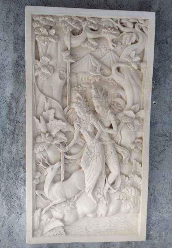 Relief dinding rumah motif Rama Sita terbuat dari batu alam paras Jogja berwarna putih yang memiliki tekstur halus yang cocok untuk desain interior dan eksterior yang memiliki kesan yang elegan dan eksotik. Hadir dengan motif khas Bali yang unik, menambah nilai estetika tidak hanya pada eksterior, melainkan juga pada desain interior bangunan rumah, mansion, villa, hotel ataupun bangunan lainnya.