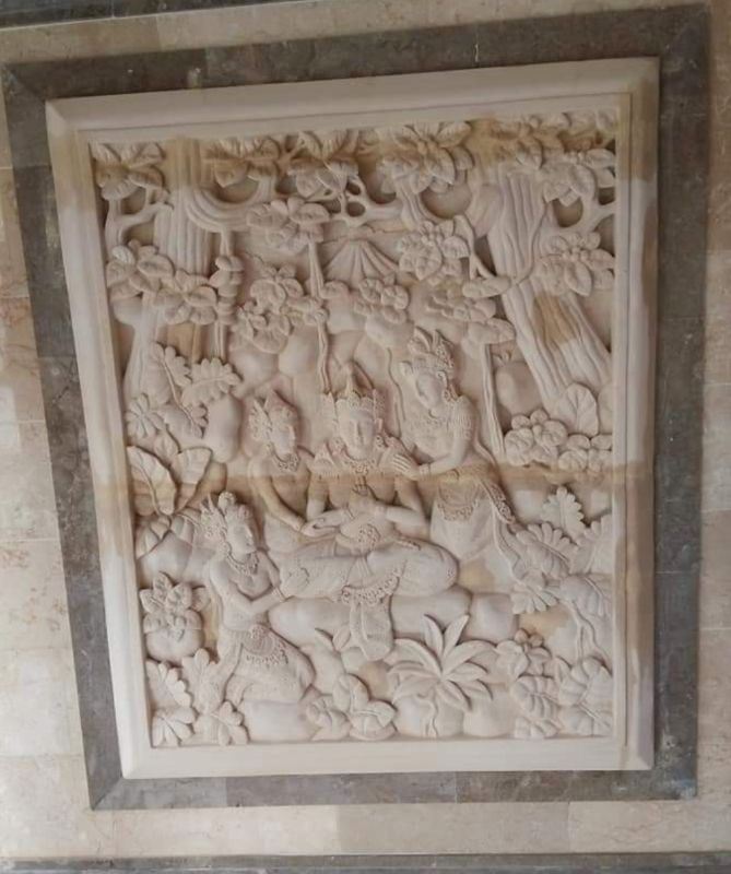 Relief Dinding Teras Arjuna Yoga, ukiran relief dinding terbuat dari batu alam paras Jogja berwarna putih yang memiliki tekstur halus. Hadir dengan motif khas Bali yang unik, menambah nilai estetika pada bangunan rumah, villa atau restoran.