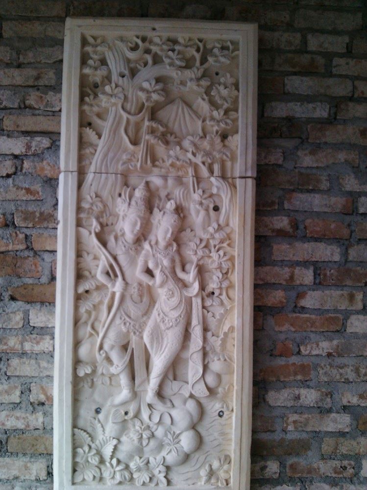 Relief Ukiran Dinding motif wiracarita atau cerita pewayangan legendaris. Terbuat dari bahan batu paras Jogja yang berwarna putih.