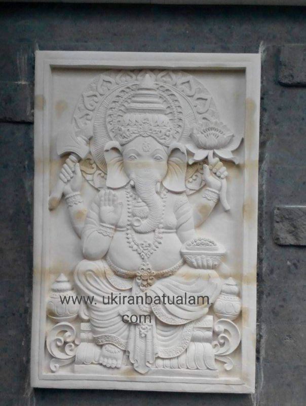 Ukiran batu alam motif Ganesha khas Bali terbuat dari batu alam paras Jogja berwarna putih yang memiliki tekstur halus, cocok untuk desain dinding dan rumah atau villa. Dapat dikerjakan sesuai ukuran dan motif ataupun berbeda. Hadir dengan motif khas Bali yang unik, menambah nilai estetika tidak hanya pada eksterior taman, melainkan juga pada desain interior bangunan rumah, mansion, villa atau restoran.