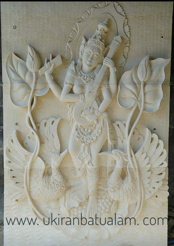 Ukiran dinding rumah motif Dewi Saraswati terbuat dari batu alam paras Jogja berwarna putih yang memiliki tekstur halus. Hadir dengan motif khas Bali yang unik, menambah nilai estetika interior maupun eksterior pada bangunan rumah, perkantoran, ataupun sekolah.